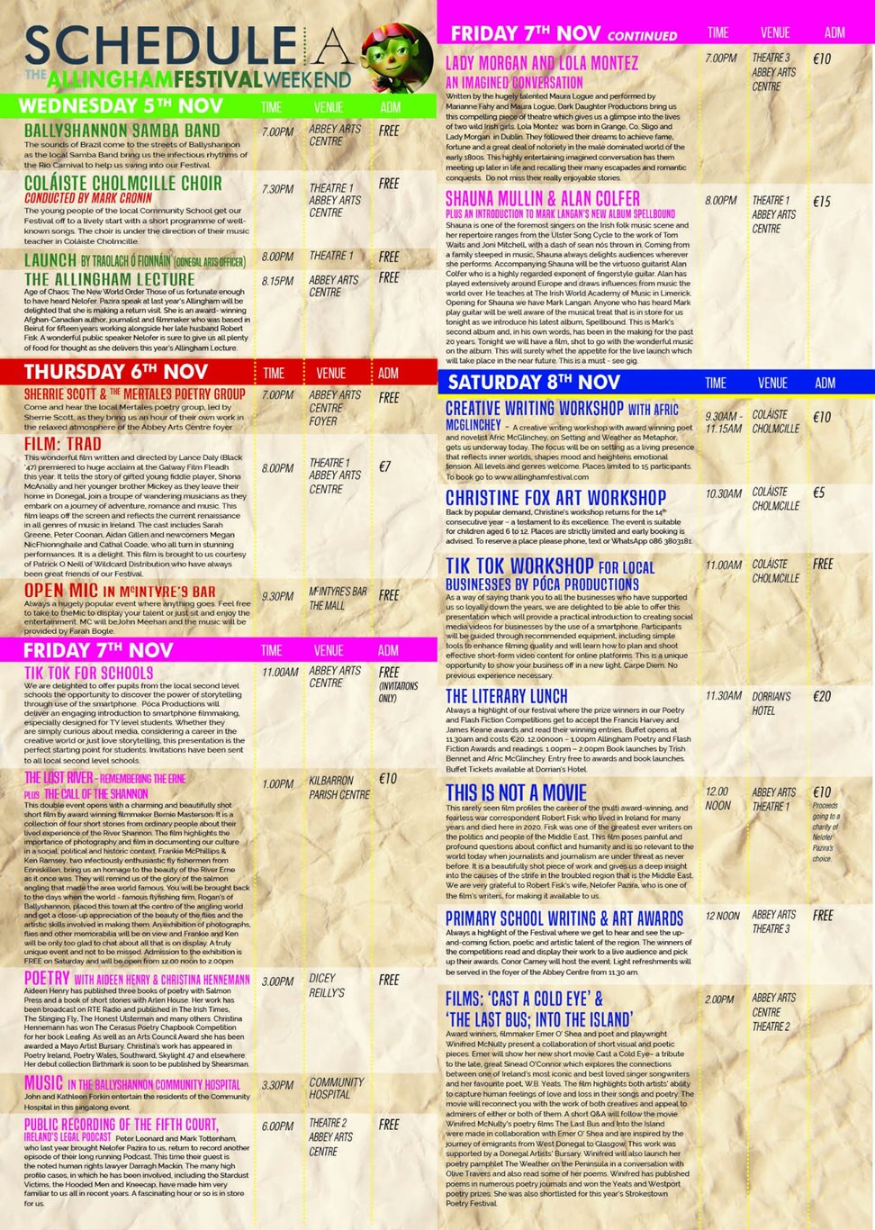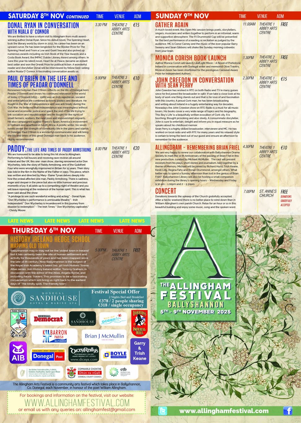 Times and locations are detailed on the Allingham website www.allinghamfestival.com. Tickets for most Festival events can be purchased online at https://abbeycentre.ie or at the Abbey Box Office. To reserve a seat in the Afric McGlinchey creative writing workshop, send email to allinghamfest@gmail.com